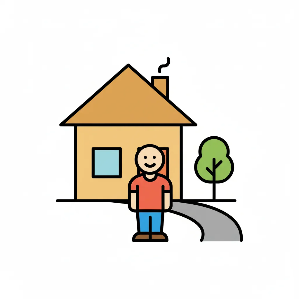 Buntes Icon: Lächelnde Person vor einem Haus mit Baum und Pfad.