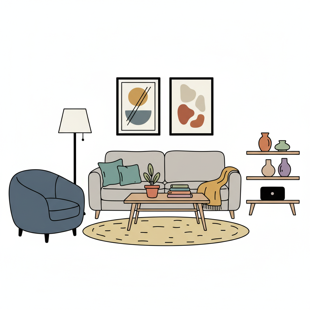Handgezeichnetes Wohnzimmer mit Sofa, Lampe, Pflanze und Teppich.