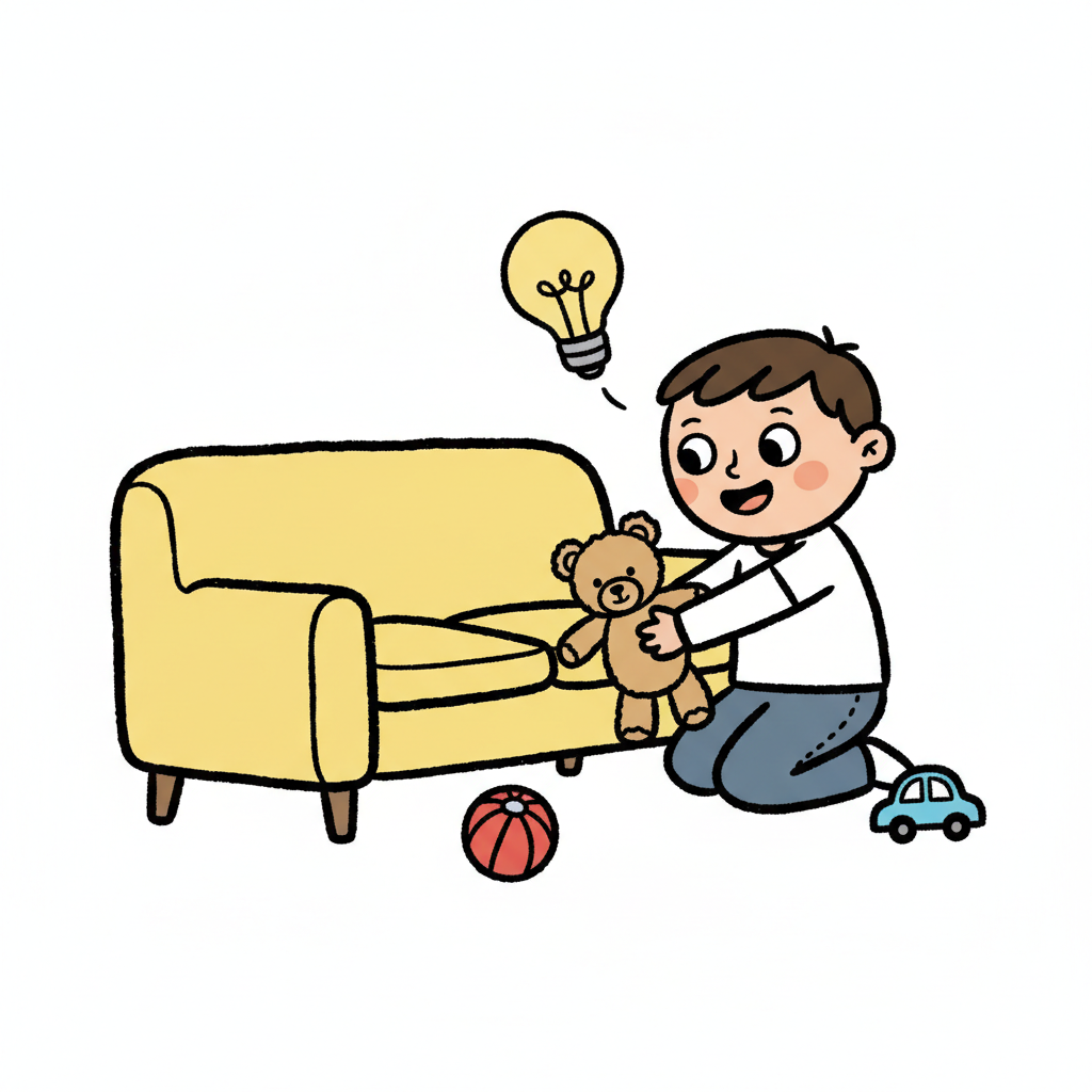 Ein Junge spielt mit einem Teddybären neben einer gelben Couch.