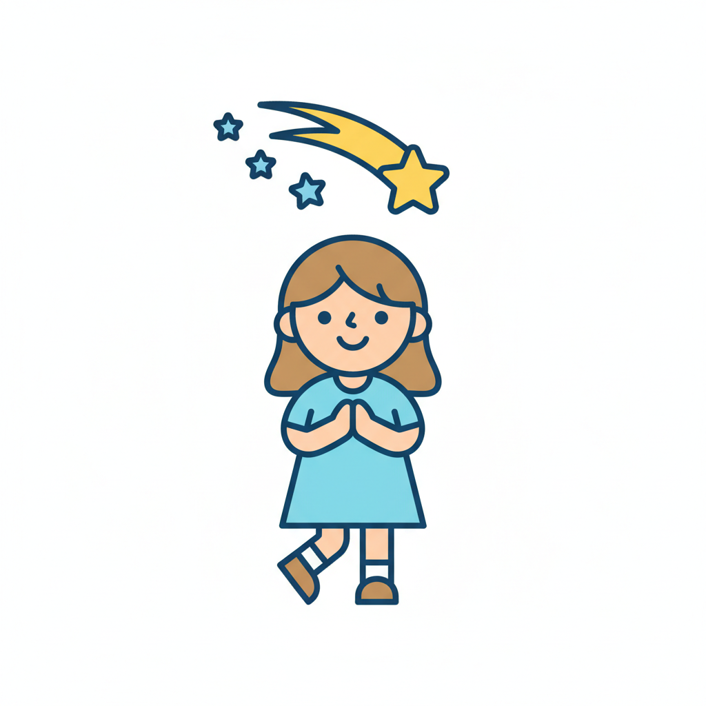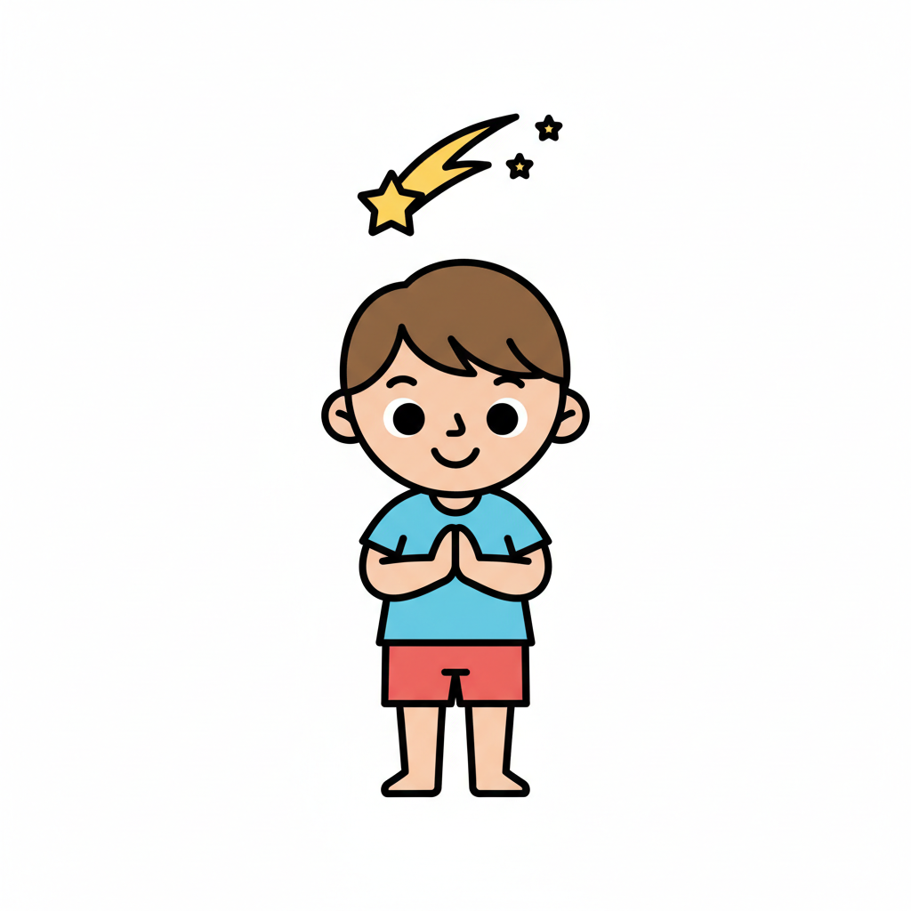 Ein lächelnder Cartoon-Junge mit gefalteten Händen und einer Sternschnuppe über dem Kopf.
