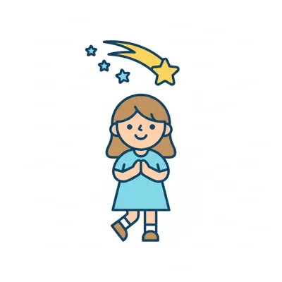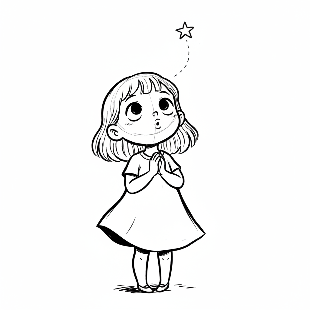 Niedliches Cartoon-Mädchen blickt mit gefalteten Händen zu einem Stern auf, als würde es sich etwas wünschen.