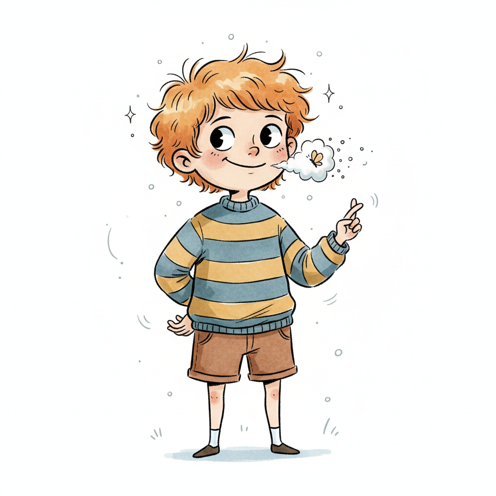 Niedliche, kindgerecht illustrierte Szene mit einem Kind oder einer Person als Hauptfigur, vor rein weißem Hintergrund, im frech-nordischen Aquarell-Skizzenstil. Klare, leicht wackelige Tuschekonturen, sichtbare Pinsel- und Strichtextur, dezente Schraffuren, weiche handgemalte Farbflächen in gedeckten Farben. Einfache, runde Formen. Keine harten Schatten, sondern sanfte, transparente Aquarellschichten. Leicht raue, handgezeichnete Linien statt glatter Vektorkanten. Subtile, vereinzelte Kritzelpunkte oder kleine Details im Hintergrund (wie Pünktchen oder feine Striche), aber keine echte Umgebung oder Landschaft. Die Figur ist mittig zentriert. Insgesamt charmant, humorvoll, warm und handgemacht wirkend. WICHTIG: Das Bild darf ABSOLUT KEINEN TEXT, KEINE BUCHSTABEN und KEINE ZAHLEN enthalten.