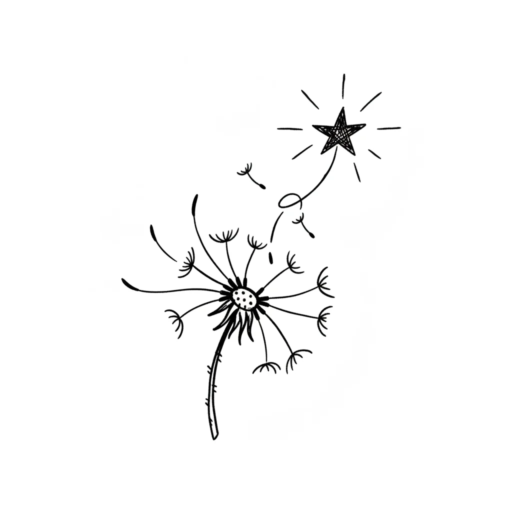 Schwarz-weiße Zeichnung einer Pusteblume, deren Samen als leuchtender Stern davonfliegt.