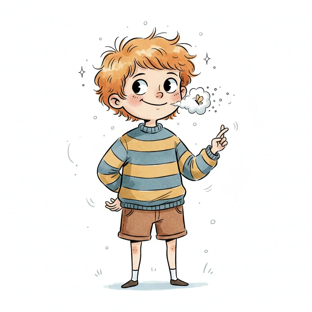 Ein lächelnder Junge mit roten Haaren pustet einen Schmetterling aus und kreuzt die Finger.