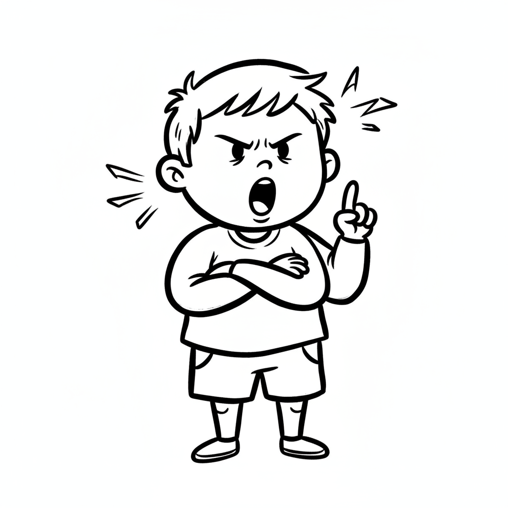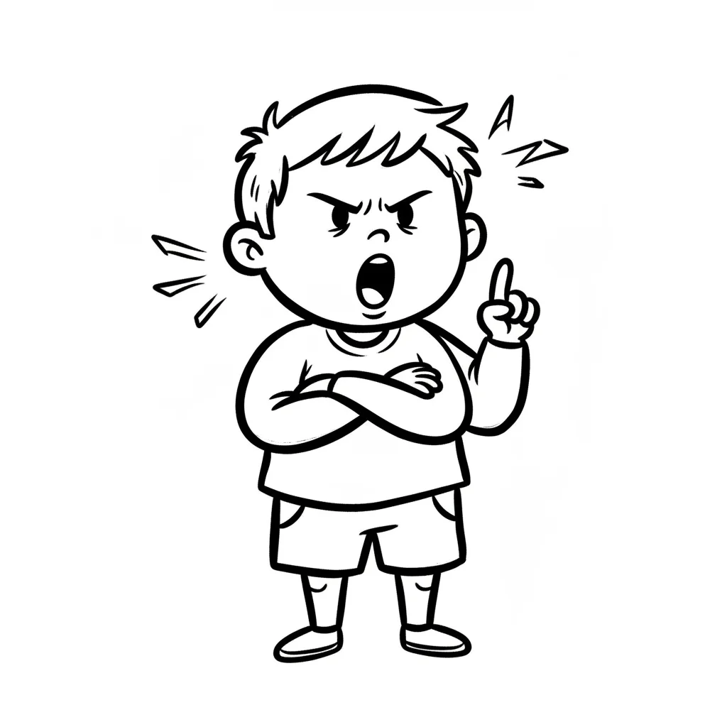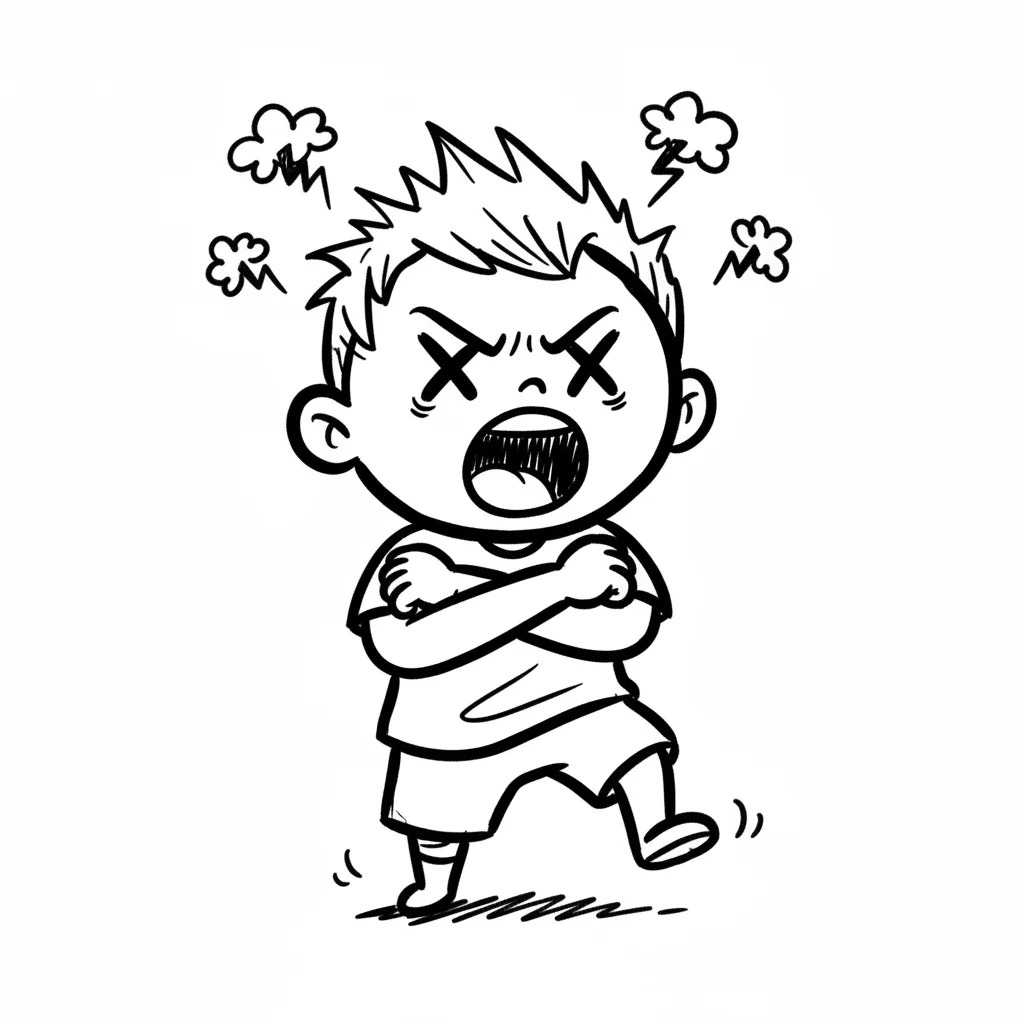 Ein wütender Junge mit geschlossenen Fäusten und einem verärgerten Gesichtsausdruck.