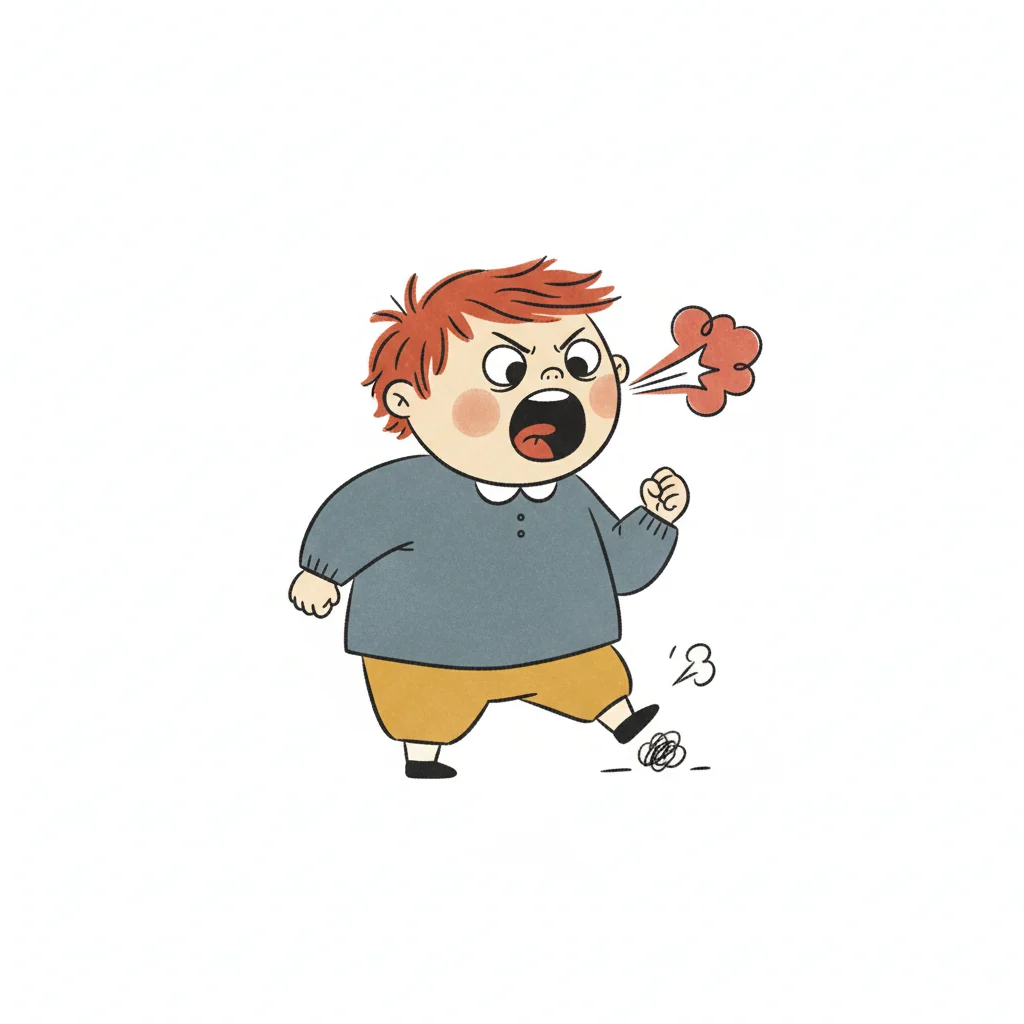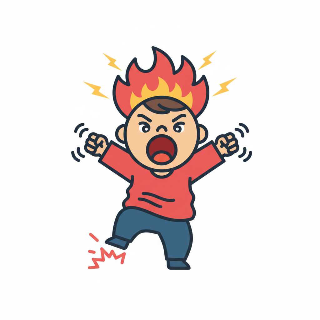 Ein wütendes Kind mit Flammenkopf, schreiend und gestikulierend.