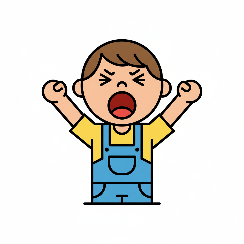 Ein schreiendes Kind mit erhobenen Händen in blauer Latzhose.