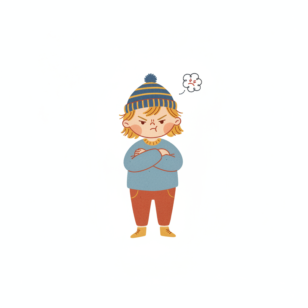 Ein ärgerlicher Junge mit Mütze und verschränkten Armen.