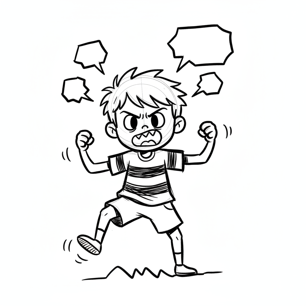 Ein wütender Junge mit erhobenen Fäusten und Sprechblasen.
