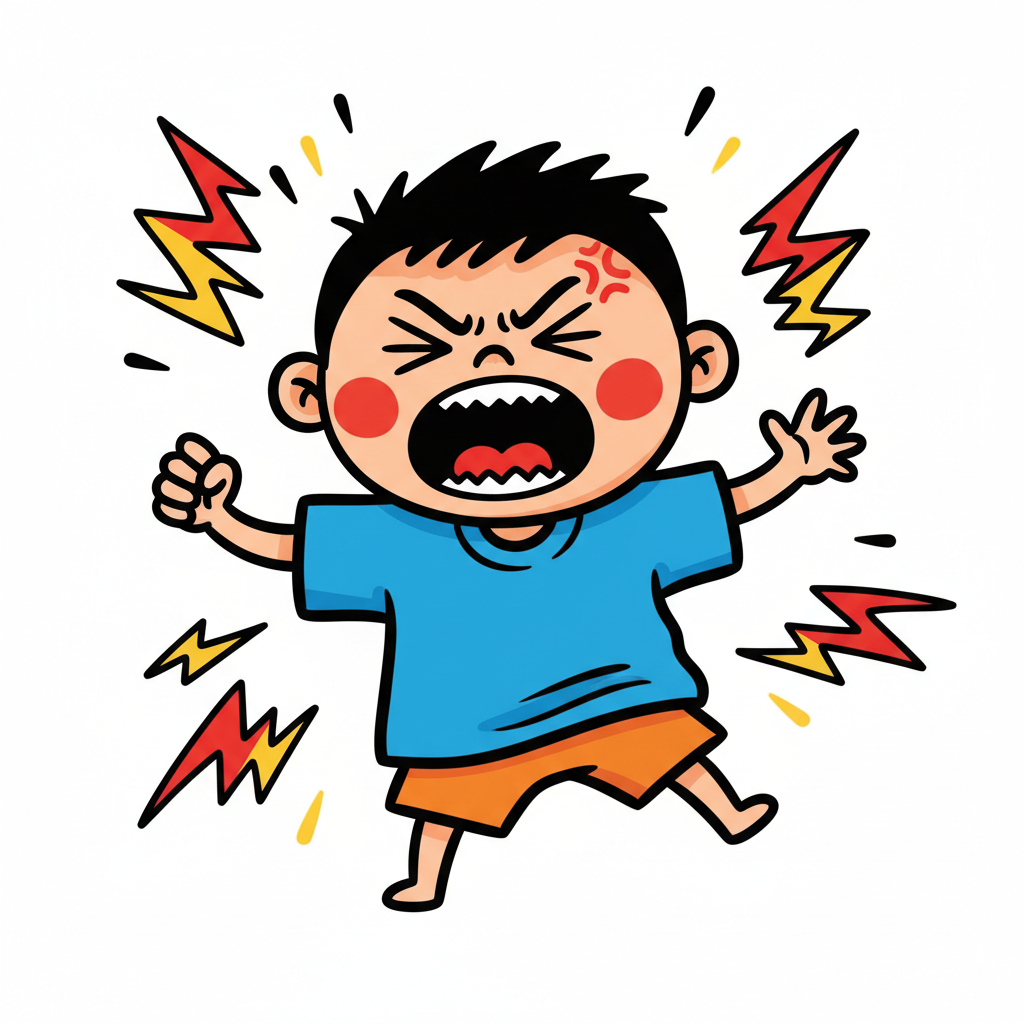 Ein wütendes Kind mit Flammenkopf, schreiend und gestikulierend.