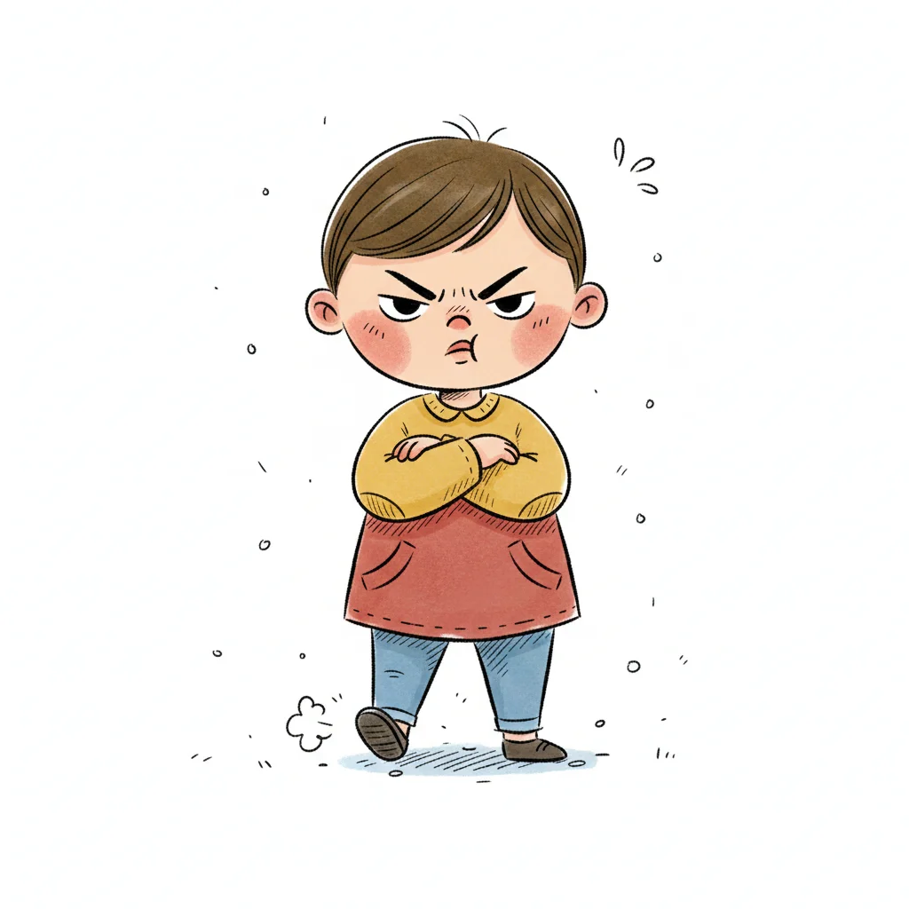 Ein wütendes Kind mit verschränkten Armen, das grimmig schaut.