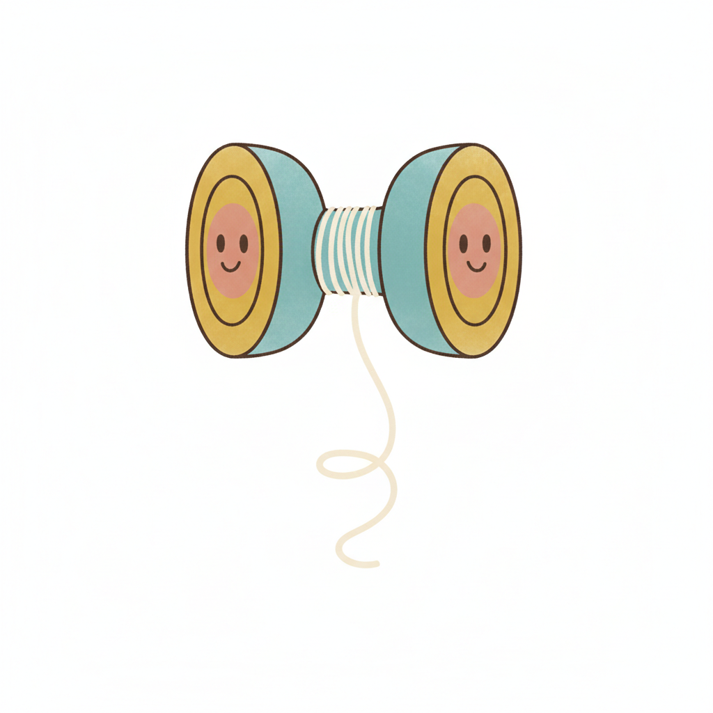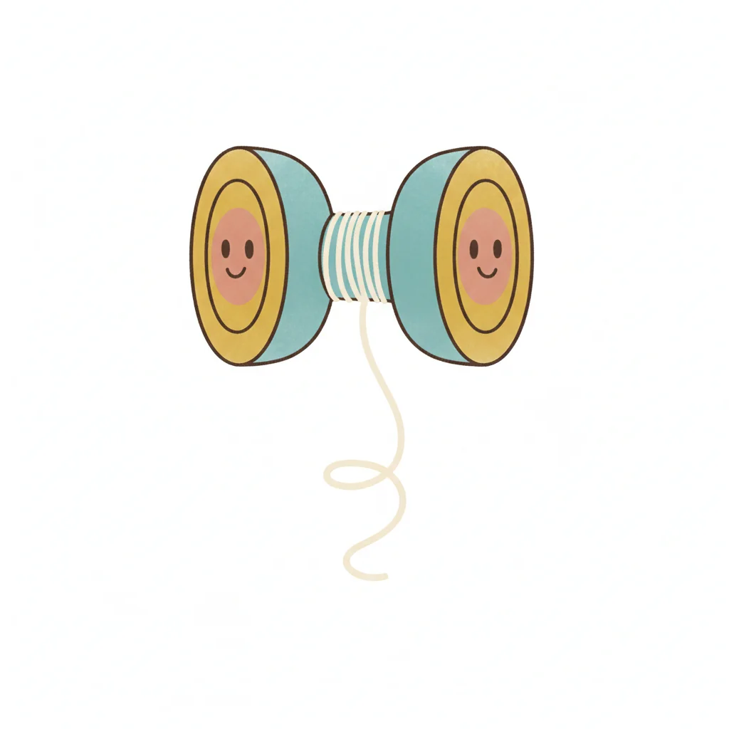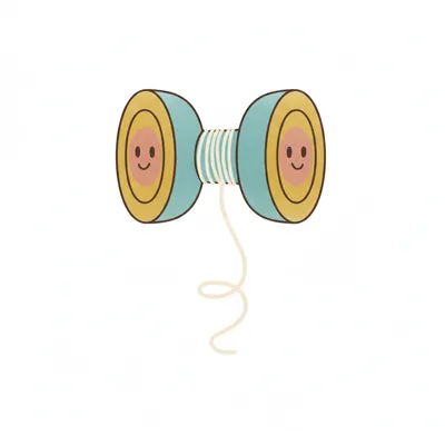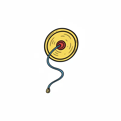 Cartoon-Stil Yo-Yo mit gelber Scheibe, rotem Zentrum und blauer Schnur auf weißem Hintergrund.