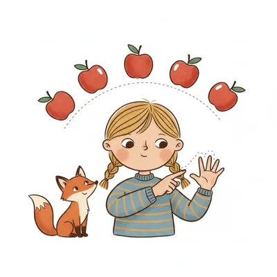 Ein Mädchen zeigt auf ihre Hand, umgeben von Äpfeln und einem Fuchs.