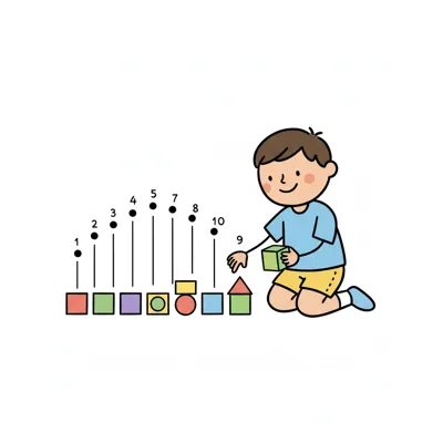 Ein Kind spielt mit bunten Bauklötzen und zählt sie.