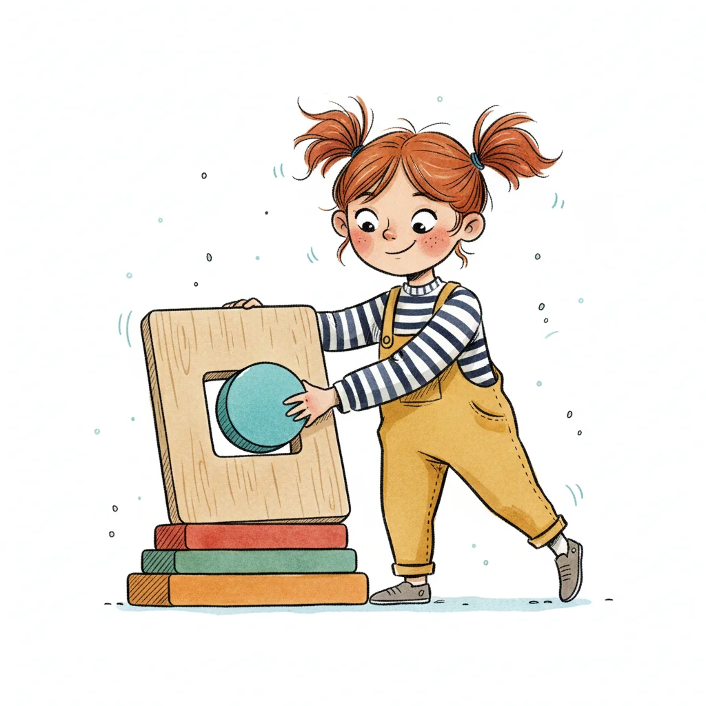 Fröhliches Mädchen mit roten Zöpfen spielt mit einem Holz-Formensortierer und einem blauen Kreis.