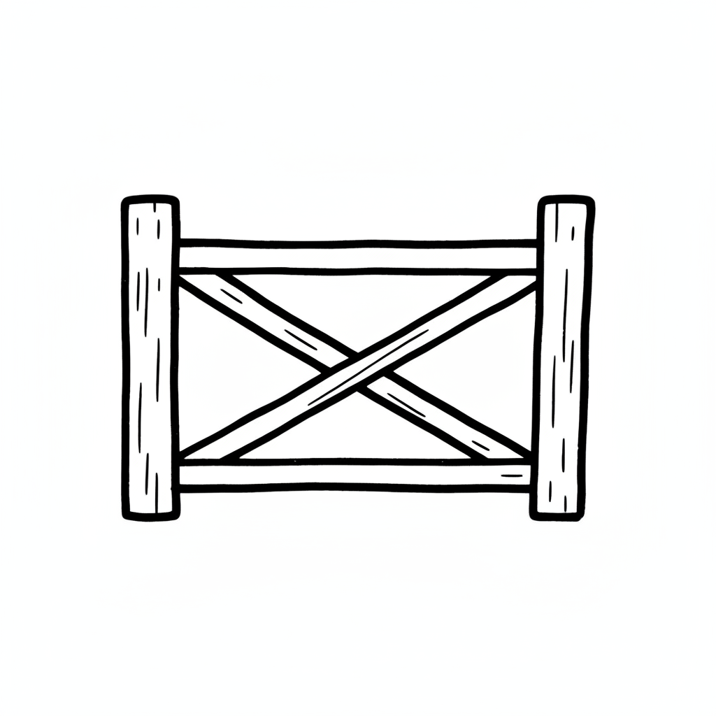 Ein einfaches, skizzenhaftes Holzgebäude mit zwei vertikalen und zwei diagonalen Balken.