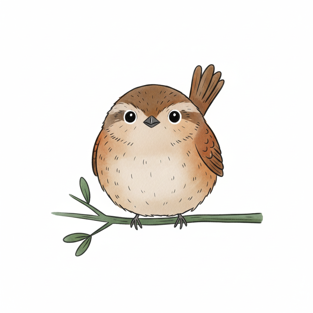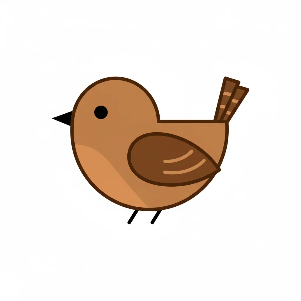 Ein schlichtes, braunes, cartoonhaftes Vogelmotiv mit runder Form.