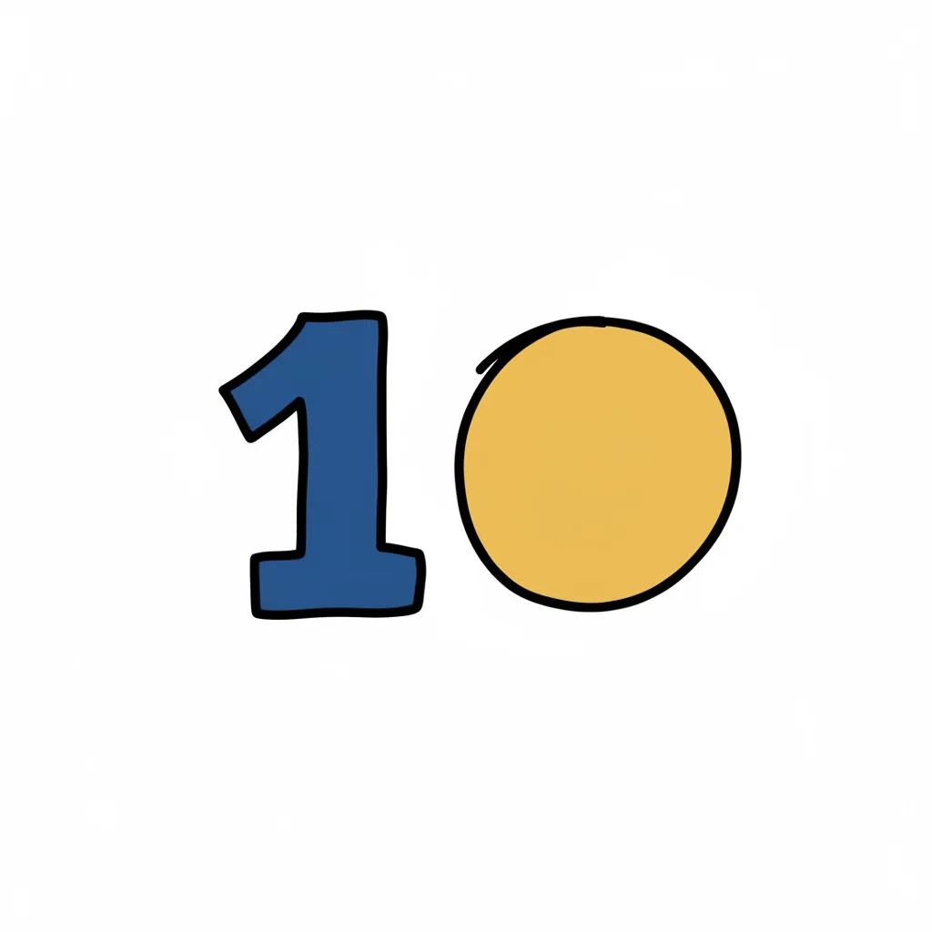 Die Zahl 10, dargestellt als blaue '1' und gelber Kreis mit schwarzem Umriss auf weißem Grund.