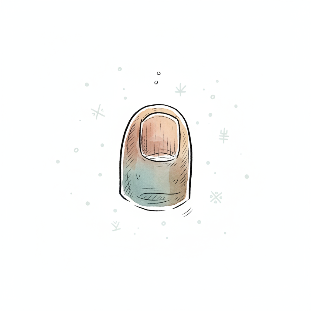 Kalt aussehende Zehe mit Farbschattierungen und Schneeflocken im Aquarellstil.