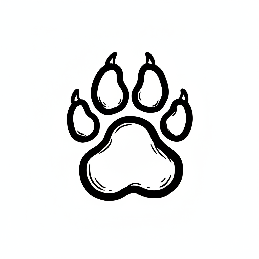 Schwarz-weißer, handgezeichneter Pfotenabdruck mit vier Zehen und einem Ballen auf weißem Grund.