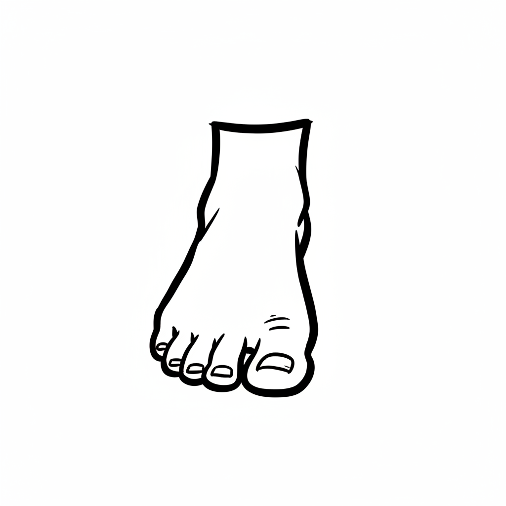 Gezeichneter Fuß mit fünf Zehen und hellem Zehennagel, isoliert auf weißem Hintergrund.