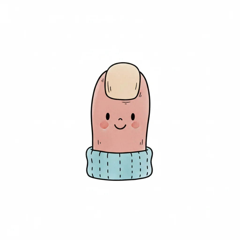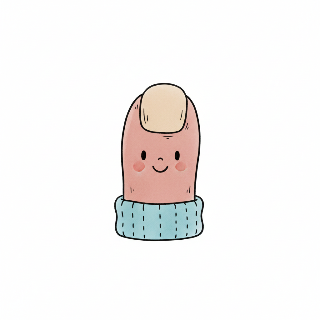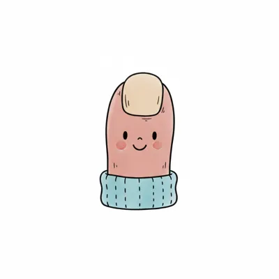 Niedlicher Cartoon-Finger mit lächelndem Gesicht, Fingernagel und blauem Strickbündchen.
