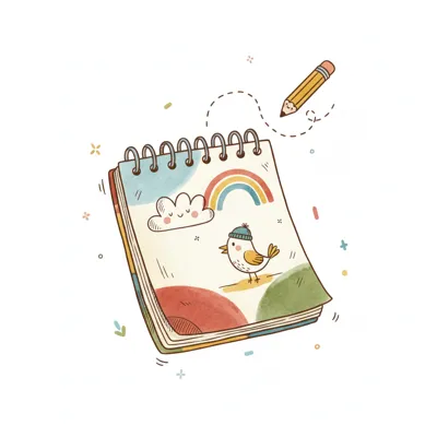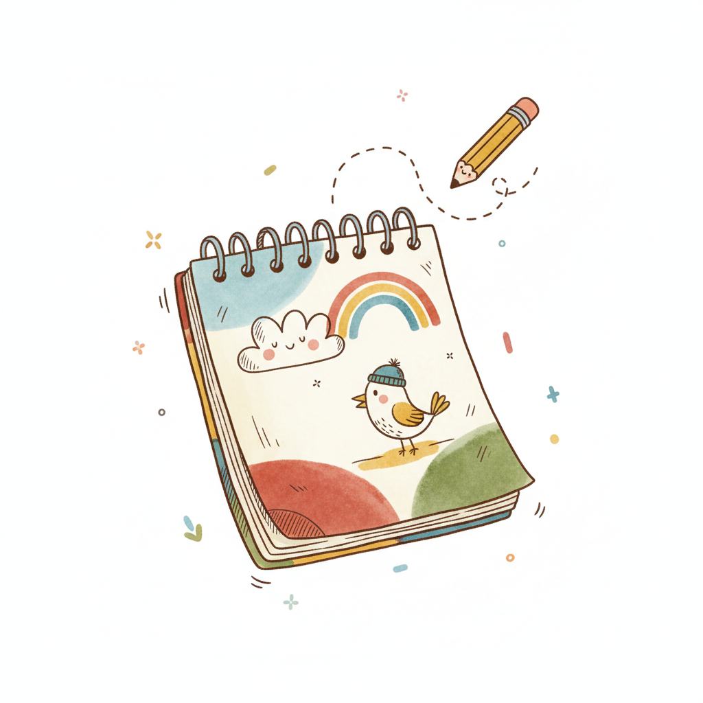 Ein Notizbuch mit einer niedlichen Zeichnung von Wolke, Regenbogen und Vogel. Ein Bleistift schwebt darüber.