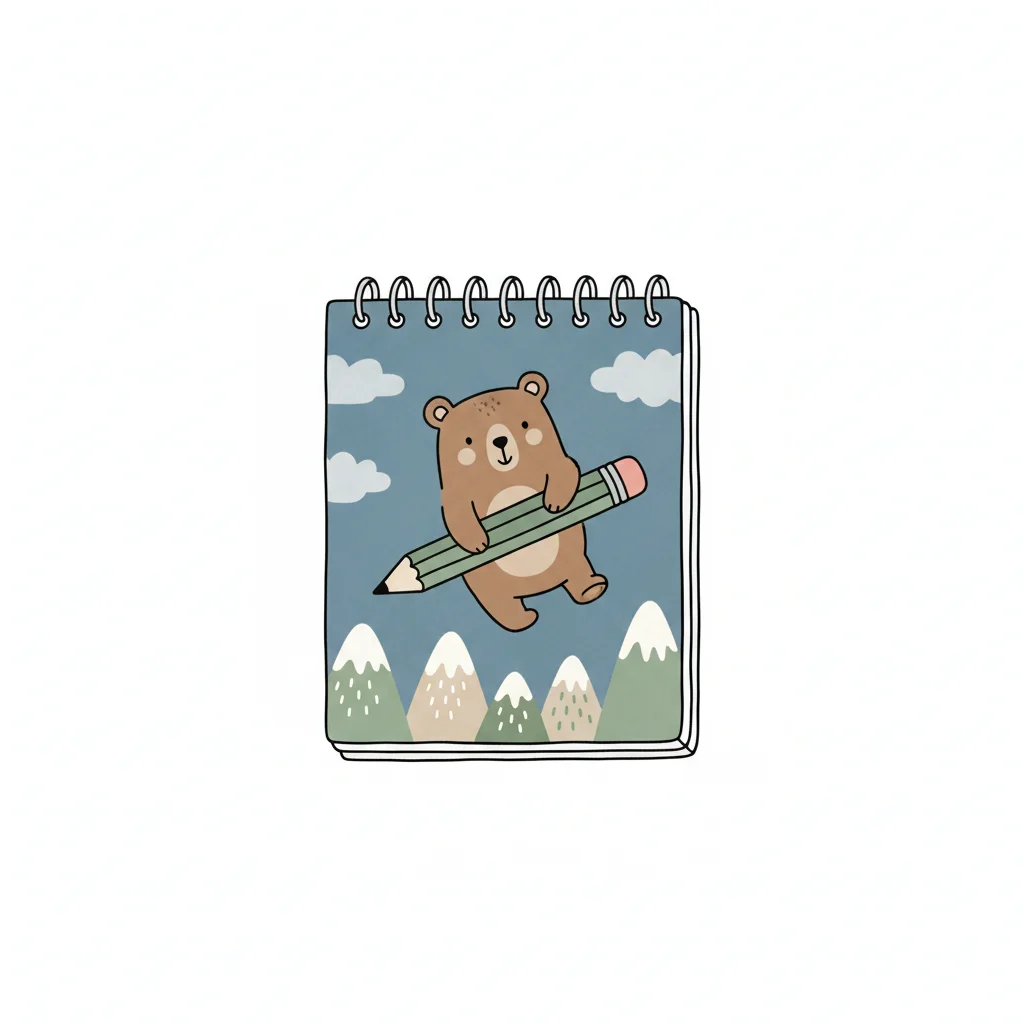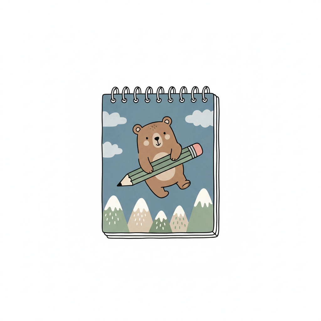 Niedlicher Cartoon-Bär fliegt mit einem Bleistift über Berge auf einem Notizblock.