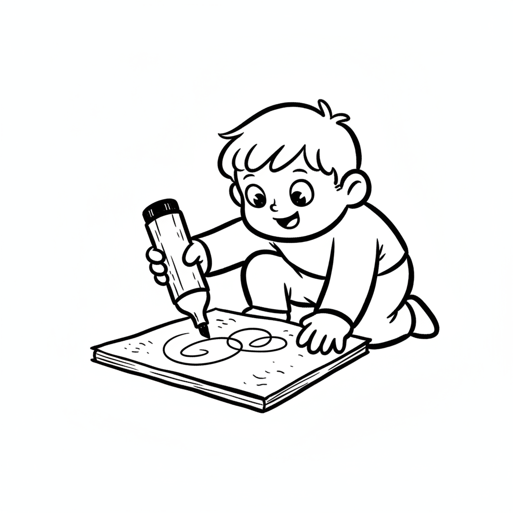 Cartoon eines lächelnden Kindes, das mit einem Filzstift auf einem Zeichenblock kritzelt.