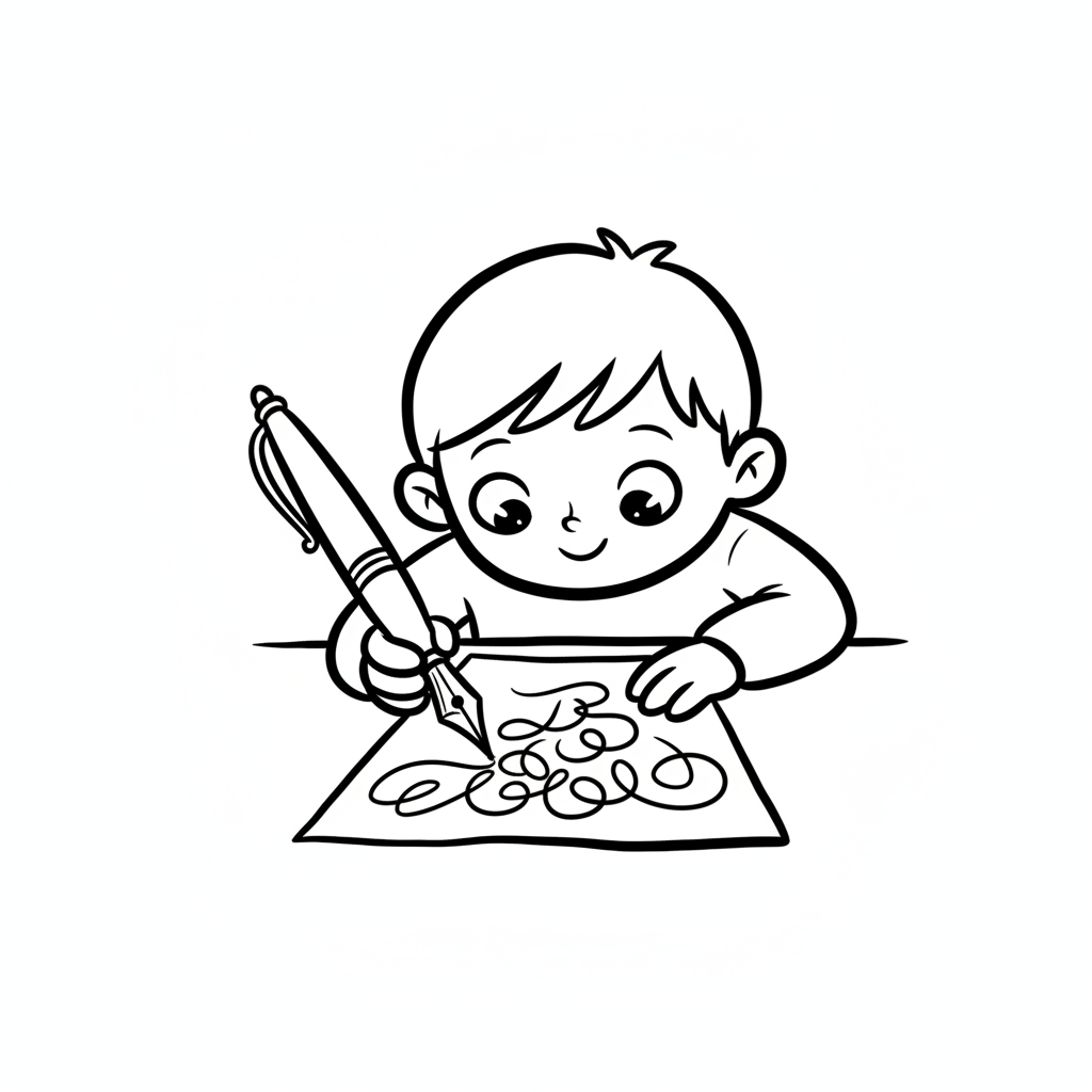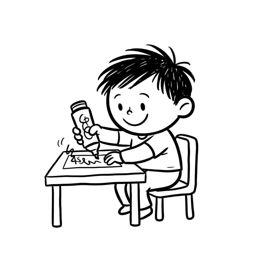 Ein Junge malt fröhlich an einem Tisch mit einem Stift.