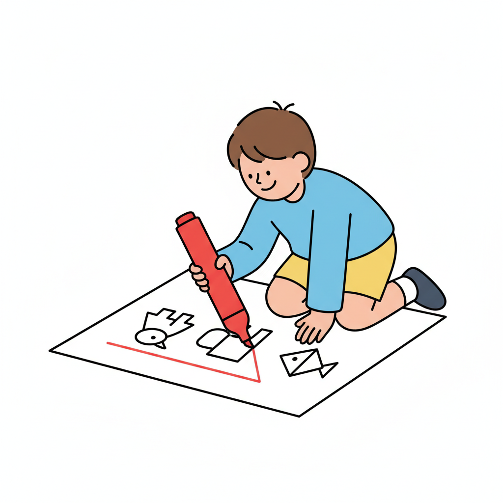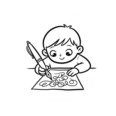 Ein Junge zeichnet mit einem großen Bleistift auf ein Blatt Papier.