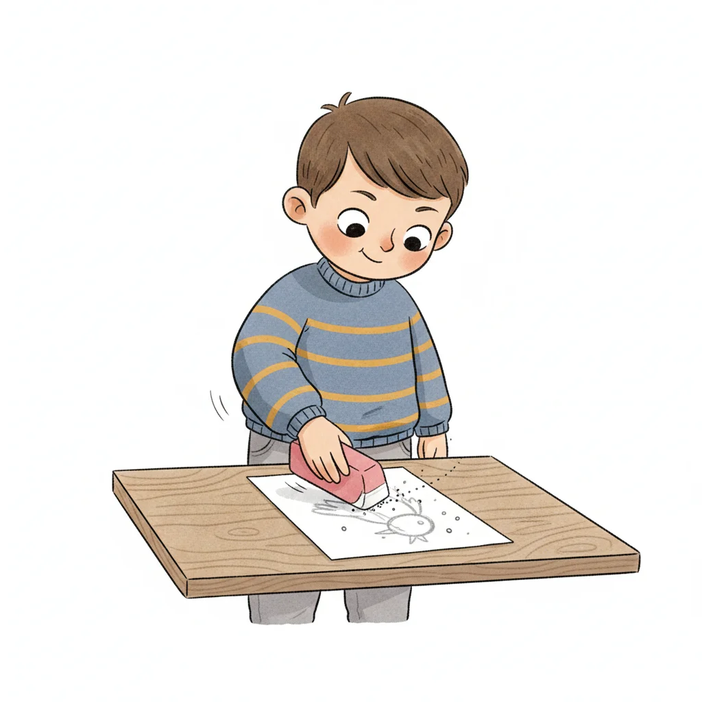 Ein Junge radiert auf einem Blatt Papier und lächelt dabei.