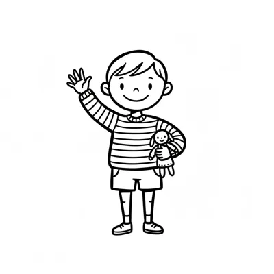Ein lächelnder Junge winkt und hält eine Puppe in der Hand.