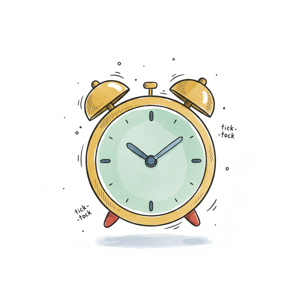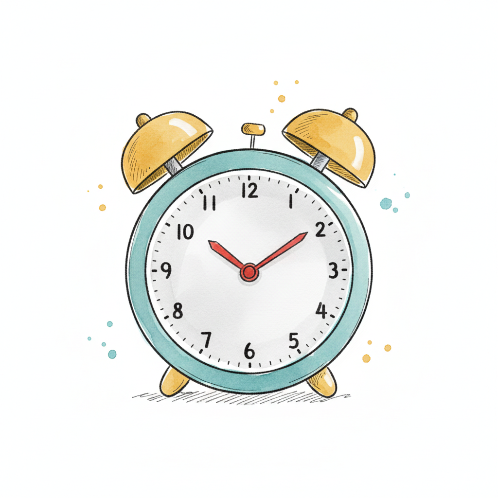 Handgezeichneter gelber Wecker mit hellblauem Zifferblatt und roten Zeigern, umgeben von Sternen.