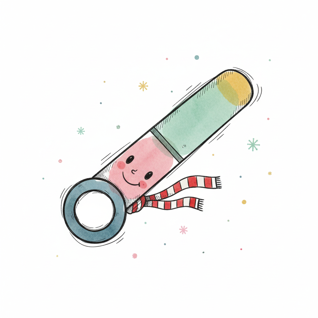 Für ältere Kinder illustrierter Gegenstand als einzelner, zentrierter Gegenstand vor weißem Hintergrund, im frech-nordischen Aquarell-Skizzenstil. Klare, leicht wackelige Tuschekonturen, sichtbare Pinsel- und Strichtextur, dezente Schraffuren, weiche handgemalte Farbflächen in gedeckten Farben. Runde, einfache Formen. Keine harten Schatten, sondern sanfte, transparente Aquarellschichten. Leicht raue, handgezeichnete Linien statt glatter Vektorkanten. Subtile, vereinzelte Kritzelpunkte oder kleine Details im Hintergrund, aber keine echte Szene. Gegenstand steht oder schwebt mittig. Insgesamt charmant, humorvoll, warm und handgemacht wirkend, wie eine moderne Illustration auf weißem Hintergrund. Gegenstände sollen keine Gesichter haben.