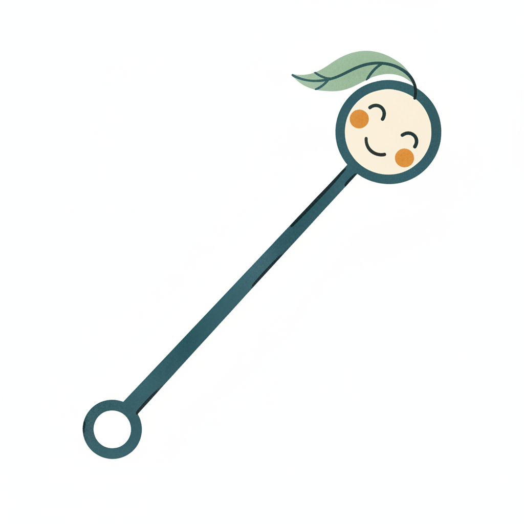 Niedlicher, lächelnder Rührstab mit Blatt im Cartoon-Stil auf weißem Hintergrund.