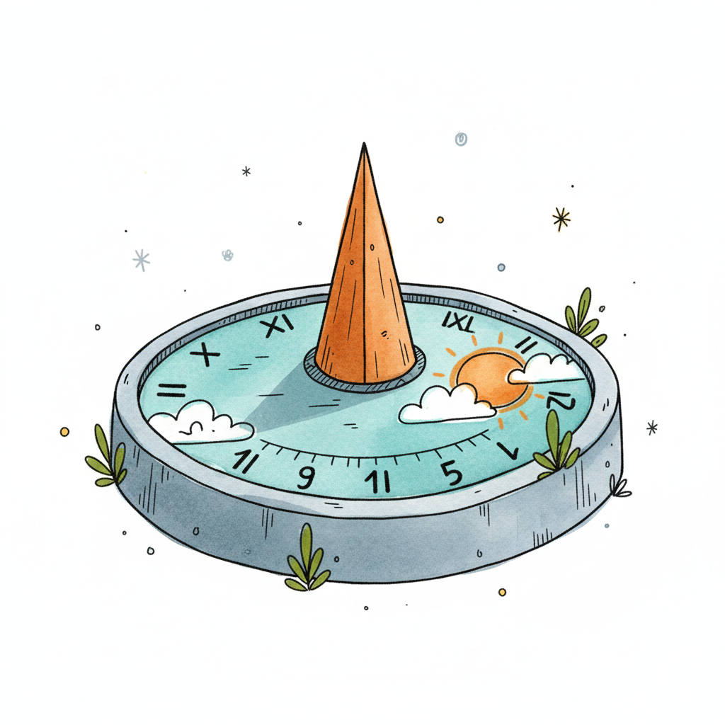 Bunte Aquarell-Illustration einer Sonnenuhr mit konischem Zeiger, Sonne, Wolken und Pflanzen.