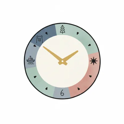 Runde, farbenfrohe Uhr mit kindgerechten Symbolen (Bär, Baum, Boot, Stern) und goldenen Zeigern.