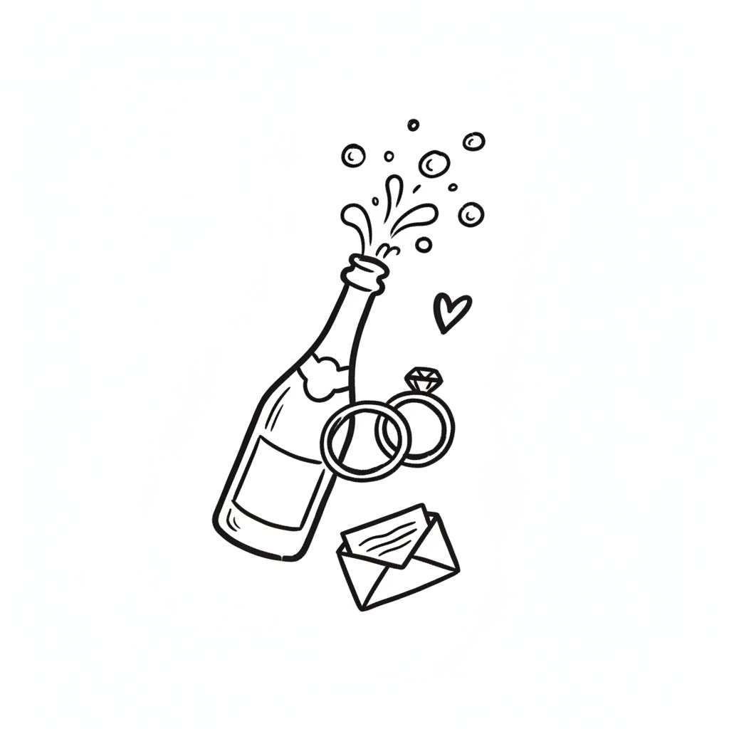 Eine Champagnerflasche mit Ringen und einem Brief, symbolisiert Feierlichkeiten.