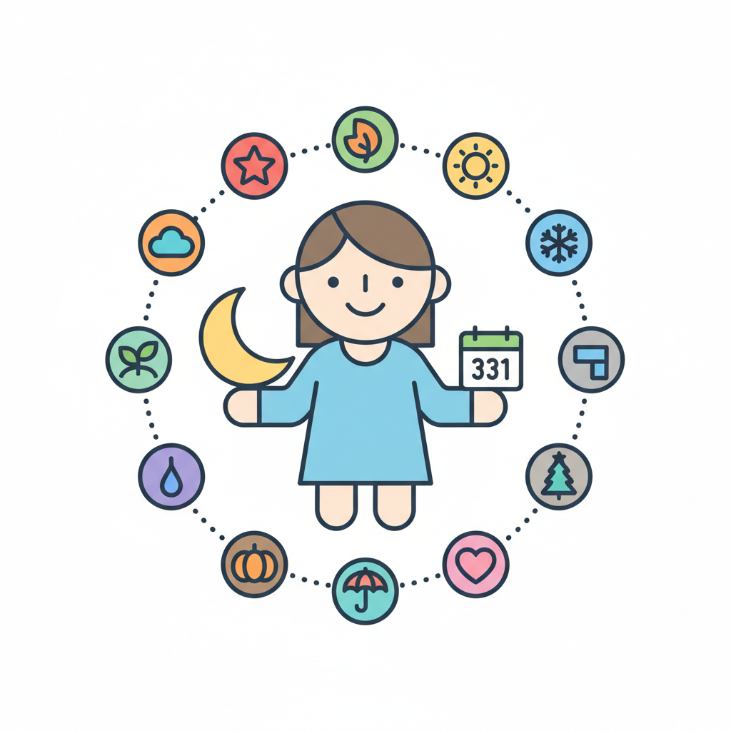 Illustration mit Sonne, Mond und saisonalen Symbolen in Kreisanordnung.