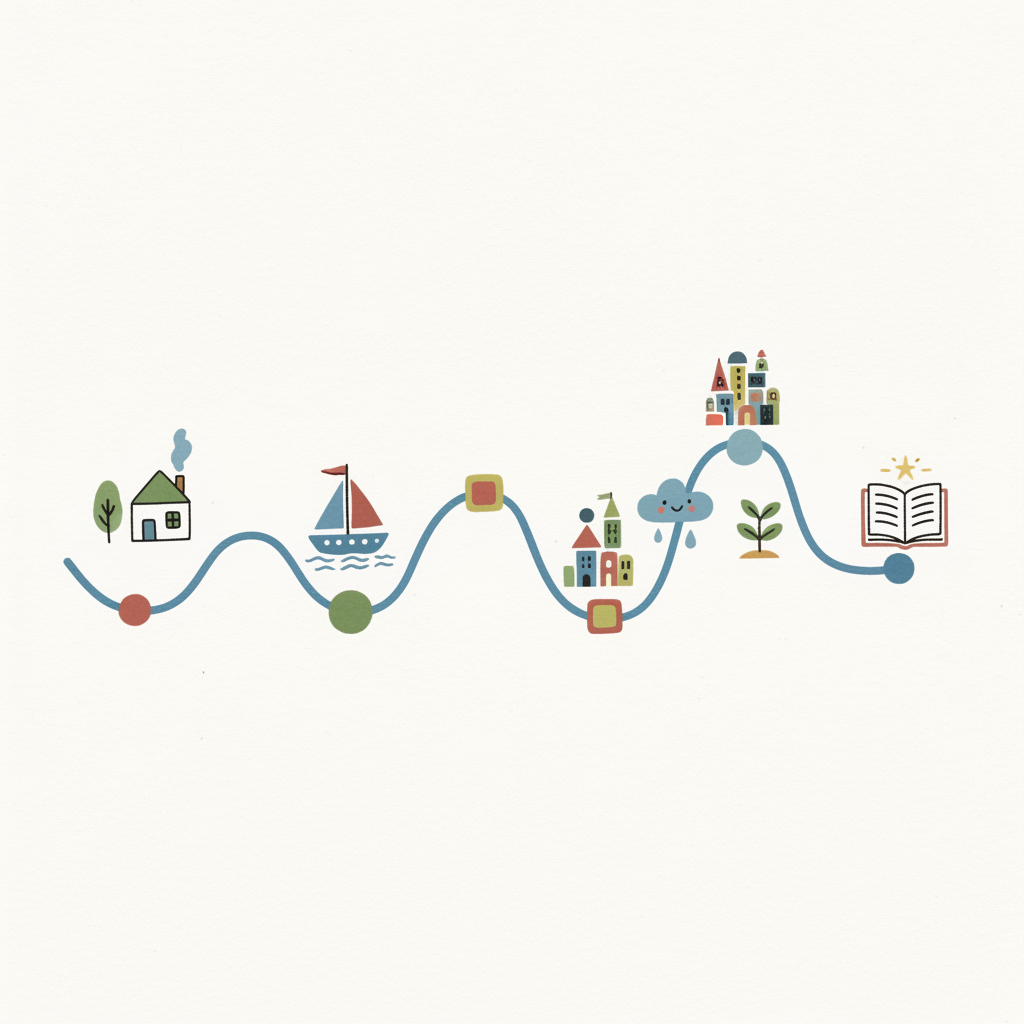Illustrierte Zeitlinie mit Haus, Boot, Stadt, Natur und Buch, die eine Lebensreise darstellt.
