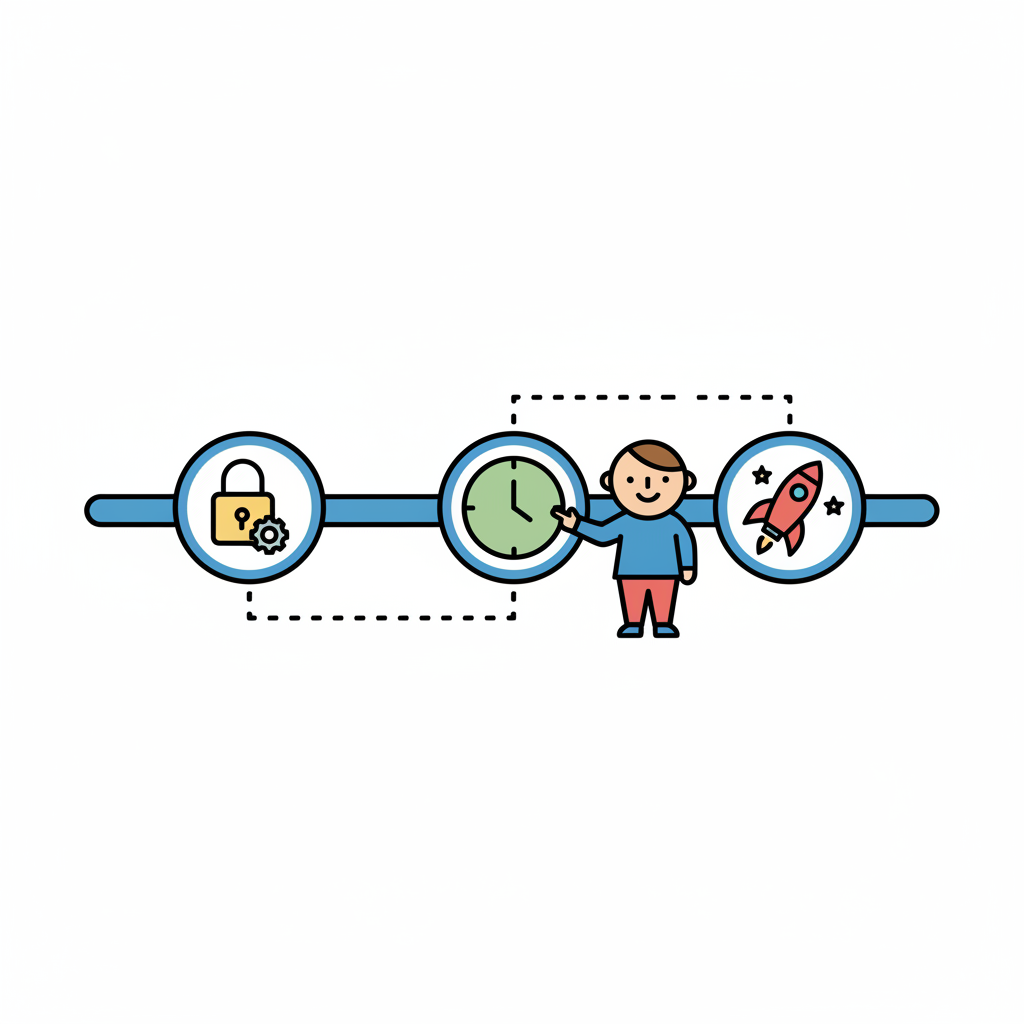 Männchen interagiert mit einem Prozess aus Sicherheit (Schloss), Zeit (Uhr) und Fortschritt (Rakete).