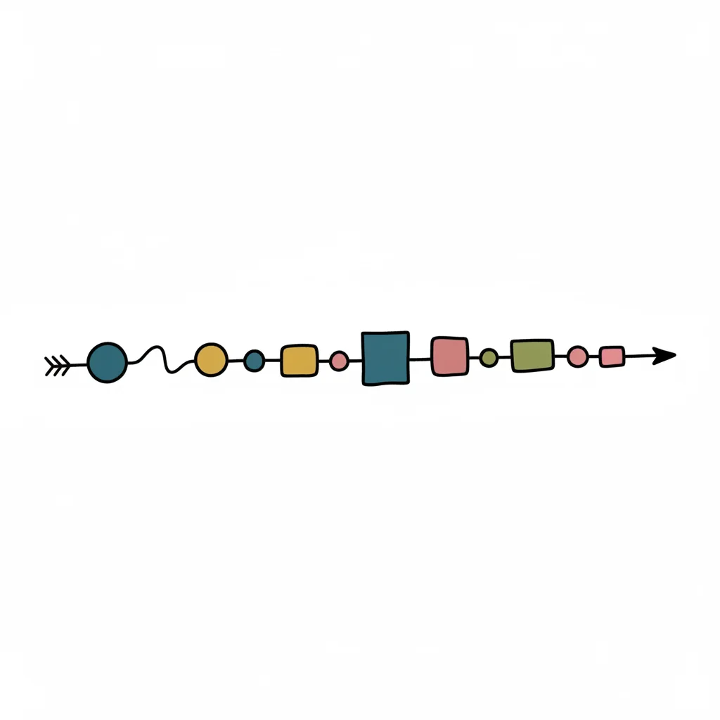 Illustrierte Zeitlinie mit Haus, Boot, Stadt, Natur und Buch, die eine Lebensreise darstellt.