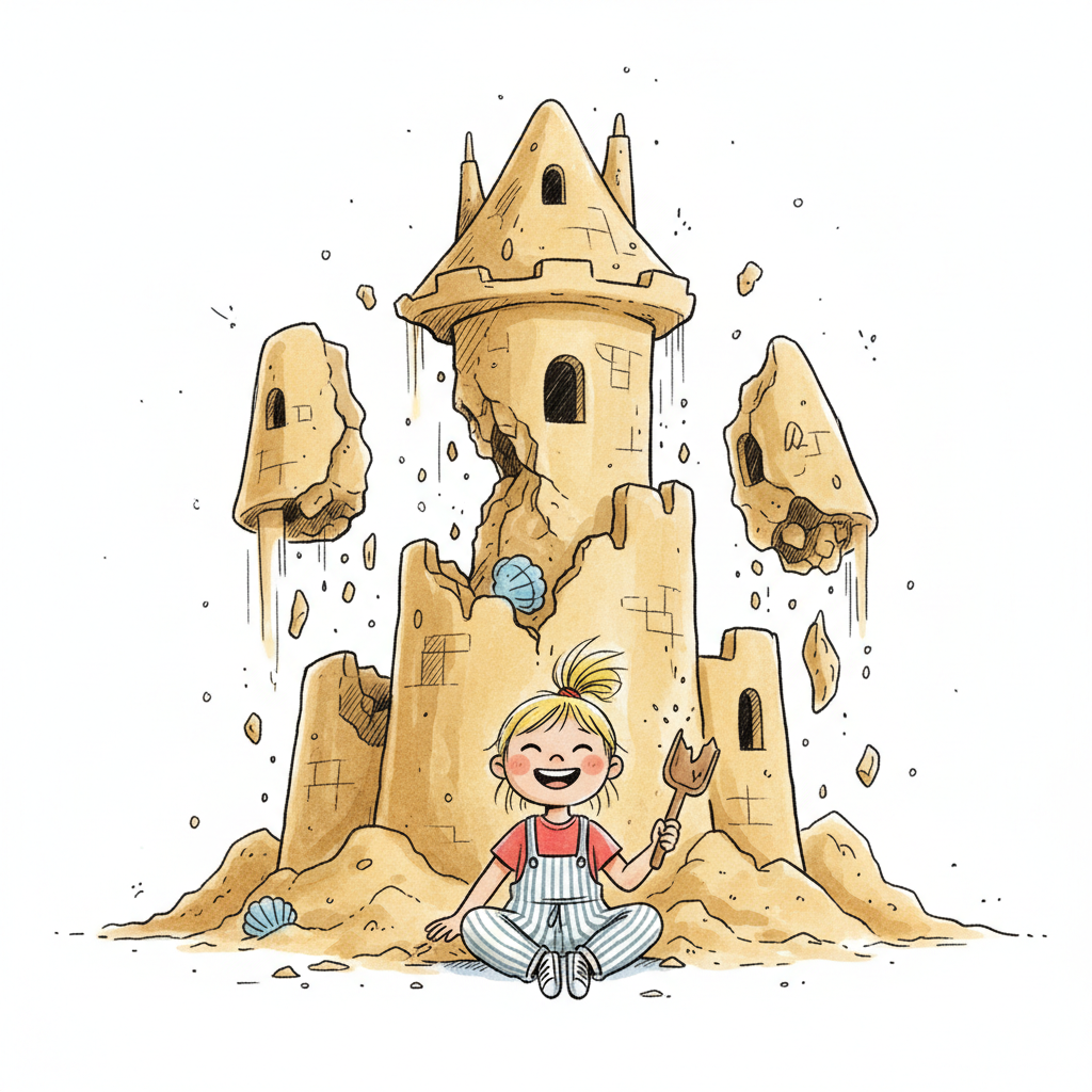 Illustration einer Sandburg, aus der Sandwürfel und kleine Kugeln fallen.