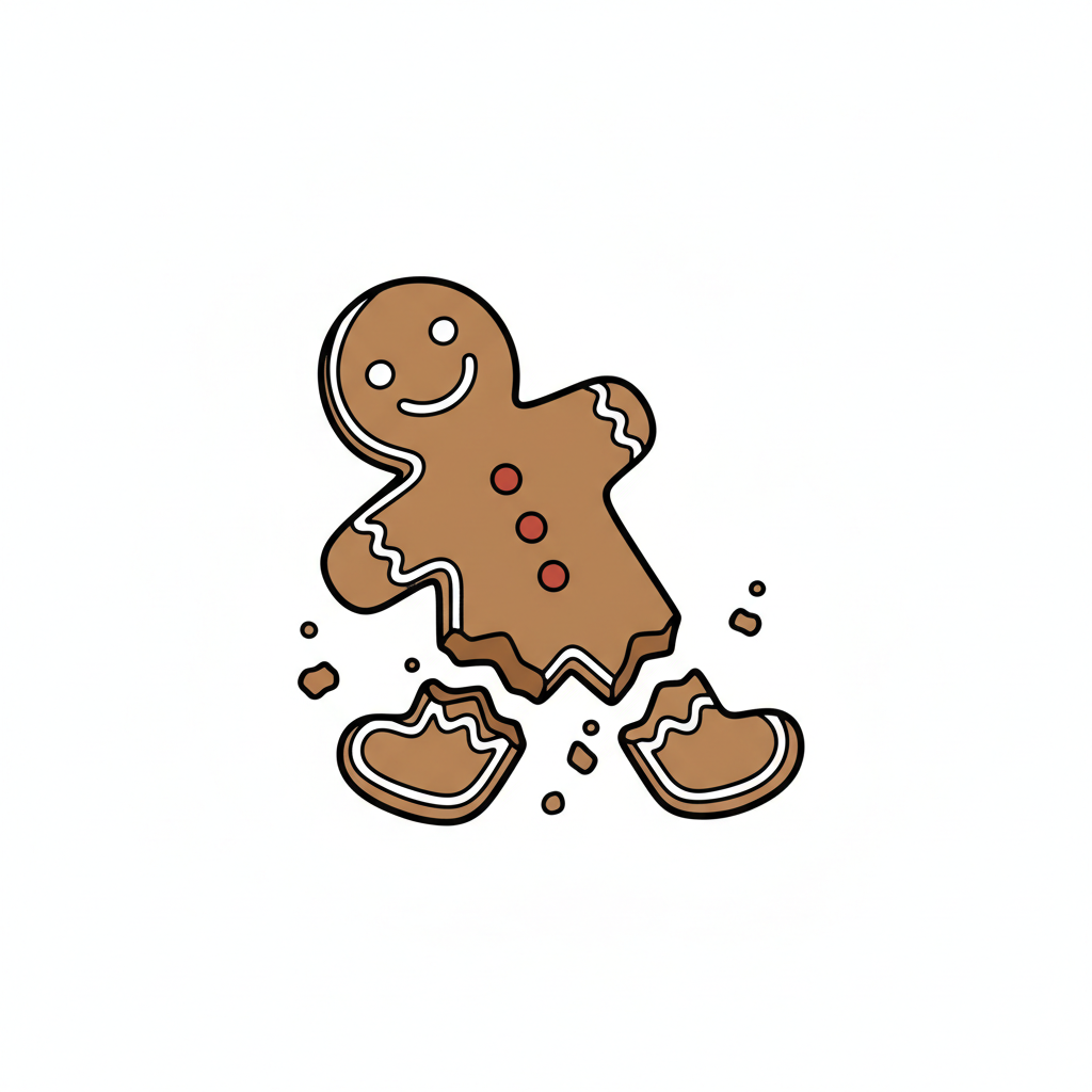 Ein lächelnder Lebkuchenmann, dessen Beine abgebrochen sind, mit Krümeln.