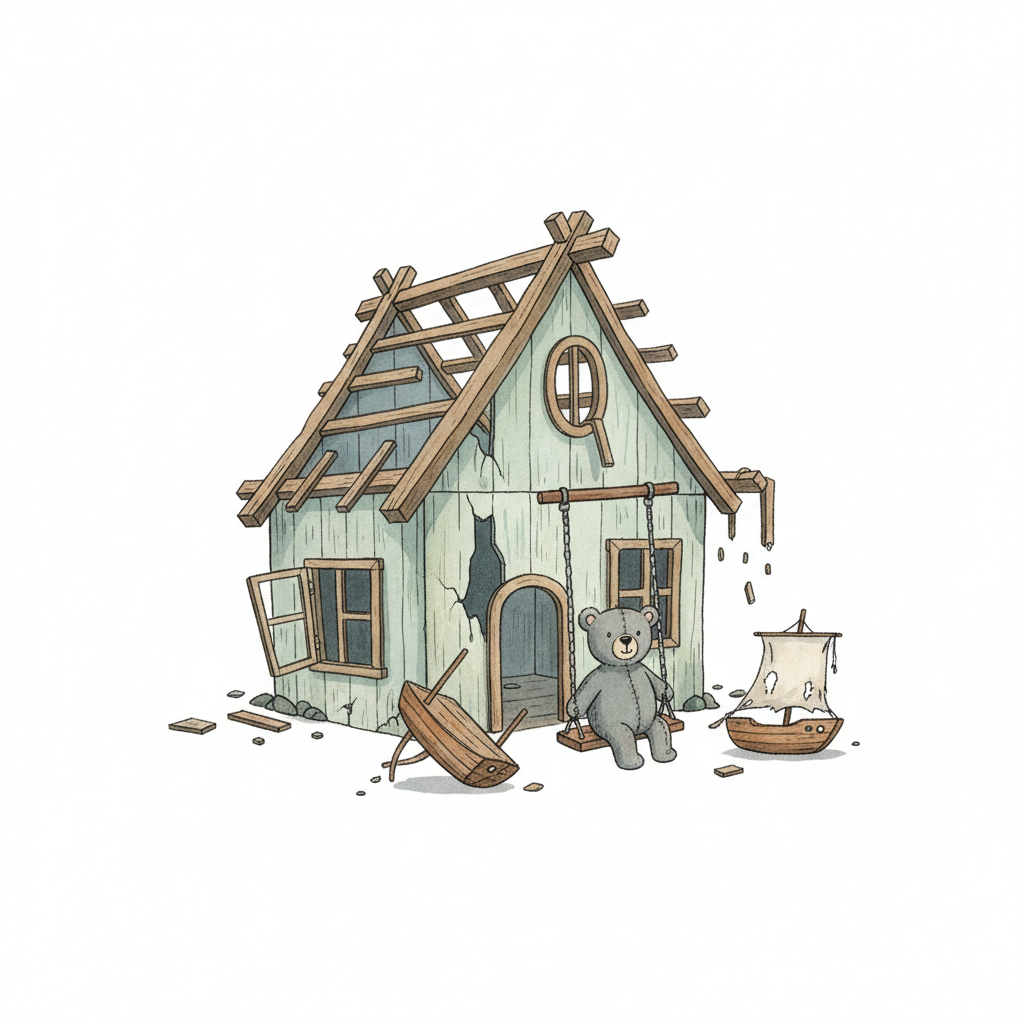 Ein verfallenes Holzhaus mit kaputtem Dach, einem Teddybär auf einer Schaukel und einem Spielzeugboot.
