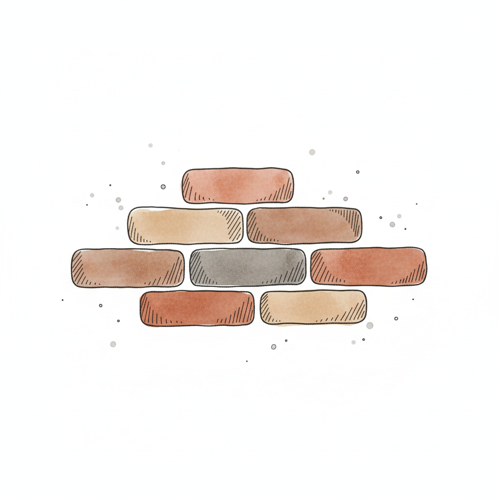 Kleine, handgezeichnete Ziegelmauer-Illustration in Aquarellfarben auf weißem Hintergrund.