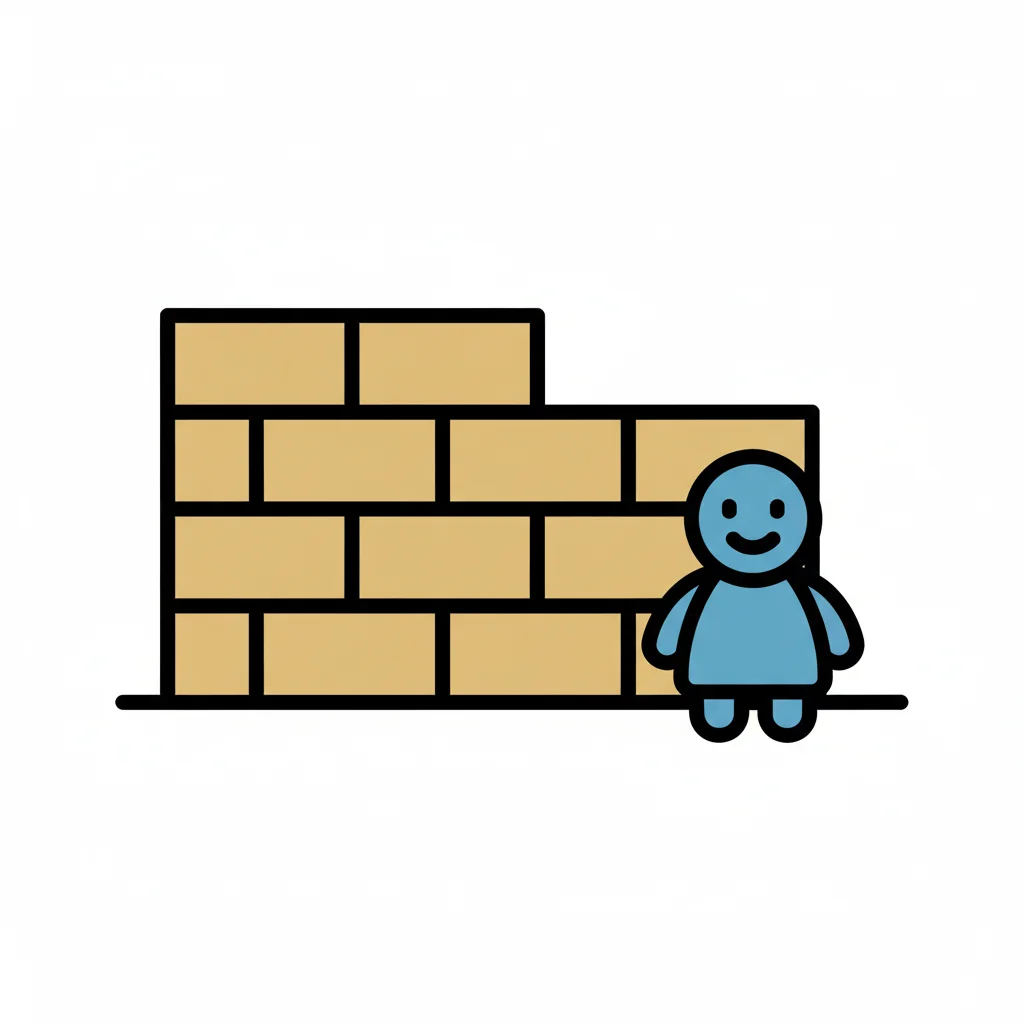 Blaue Cartoon-Figur mit Lächeln steht neben einer braunen Ziegelmauer.