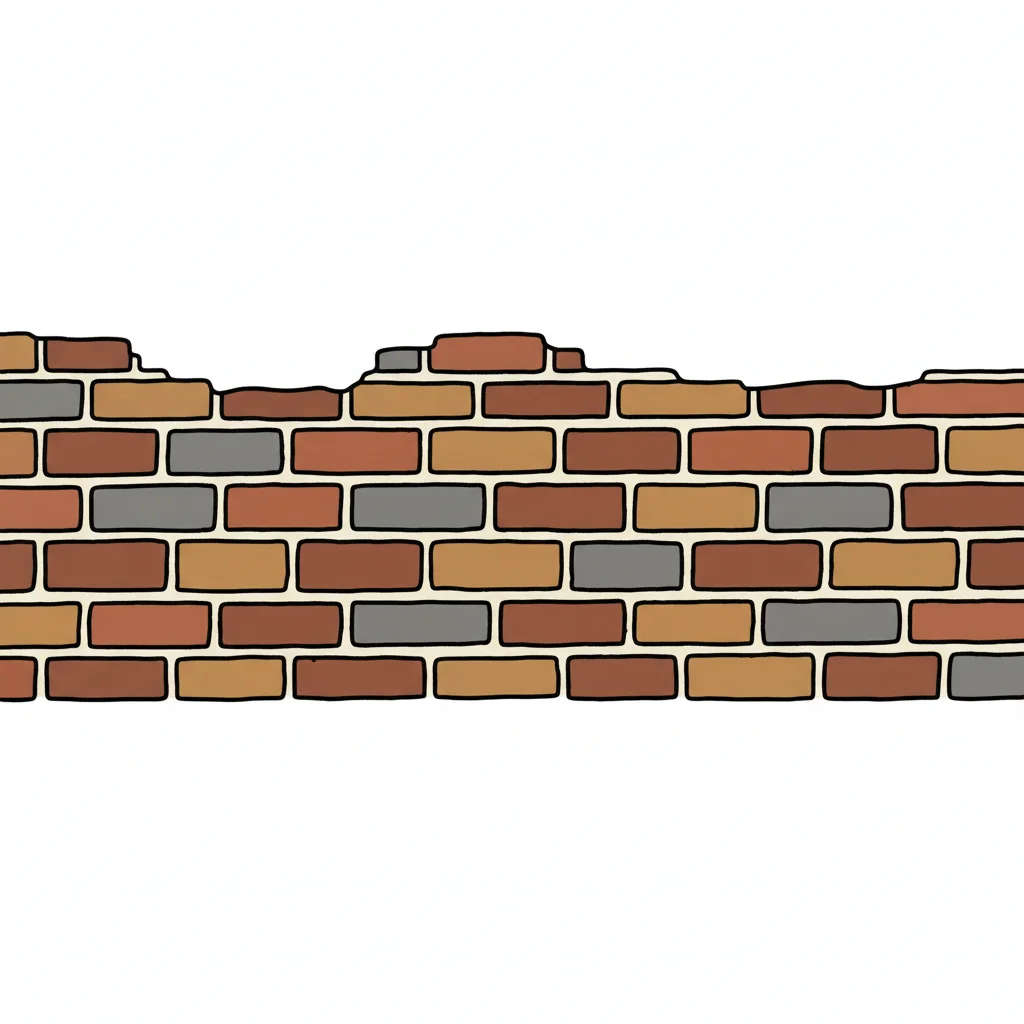 Illustrierte Ziegelmauer mit unregelmäßiger Oberkante in Brauntönen und Grau auf weißem Grund.
