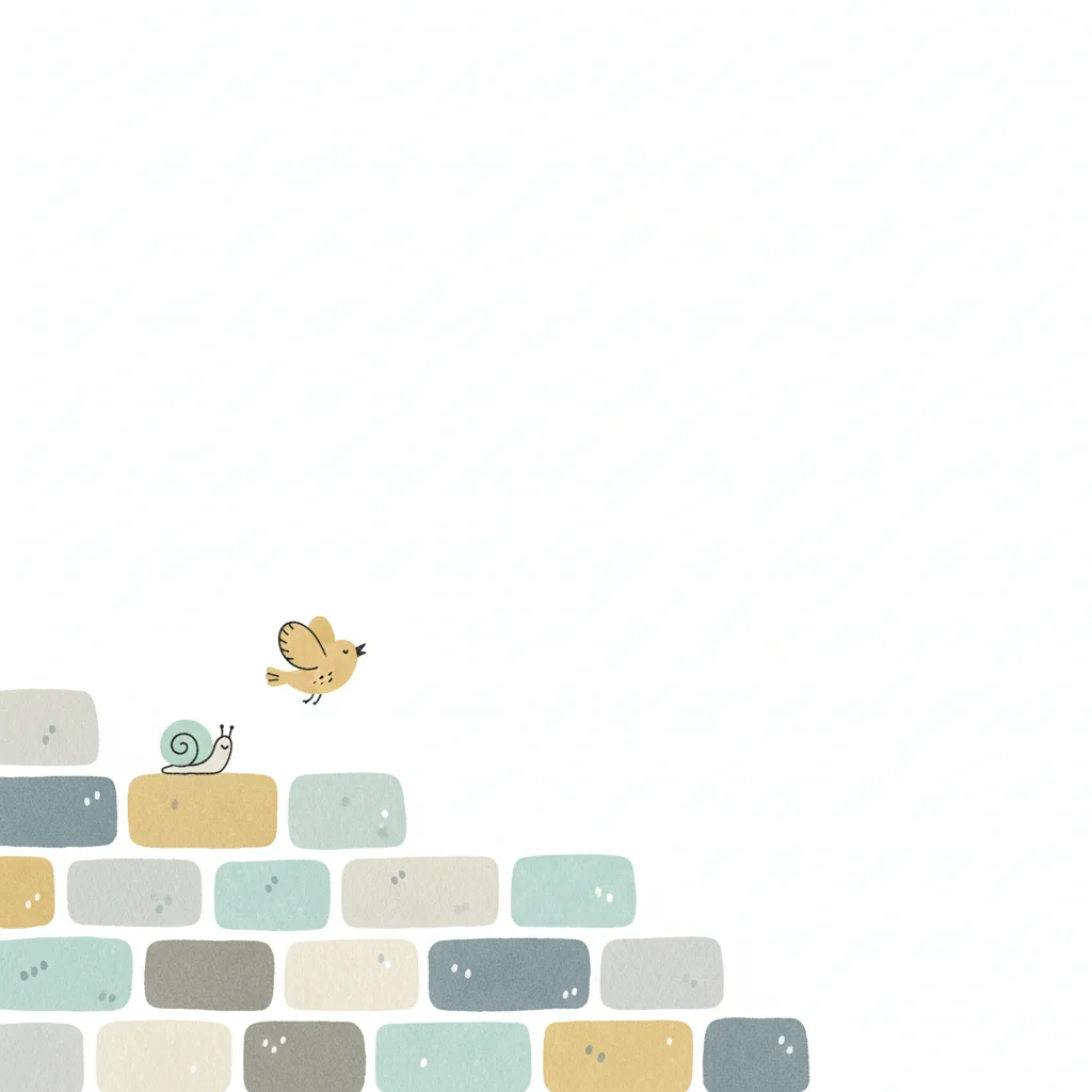 Niedliche Illustration: Eine Schnecke und ein Vogel auf einer pastellfarbenen Ziegelmauer.